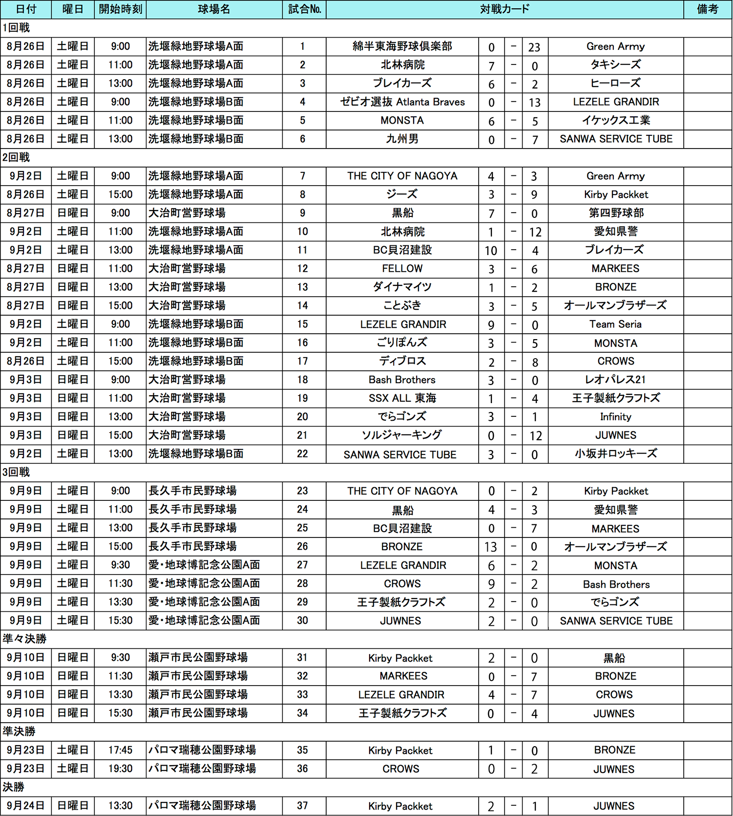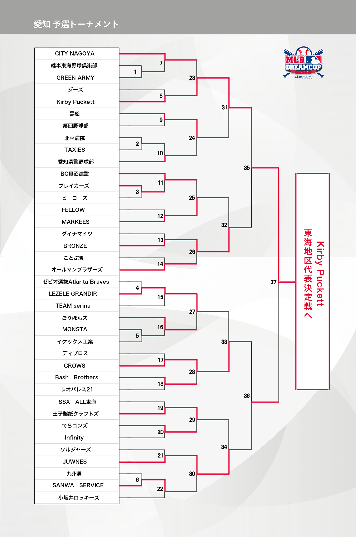 9月24日(日)に準決勝〜決勝までが行われましたので試合結果をお知らせいたします。準決勝の結果「Kirby Puckett」VS「JUWNES」で決勝となり、1-2で激戦区愛知ブロックを制したのは「Kirby Puckett」となりました、おめでとうございます!