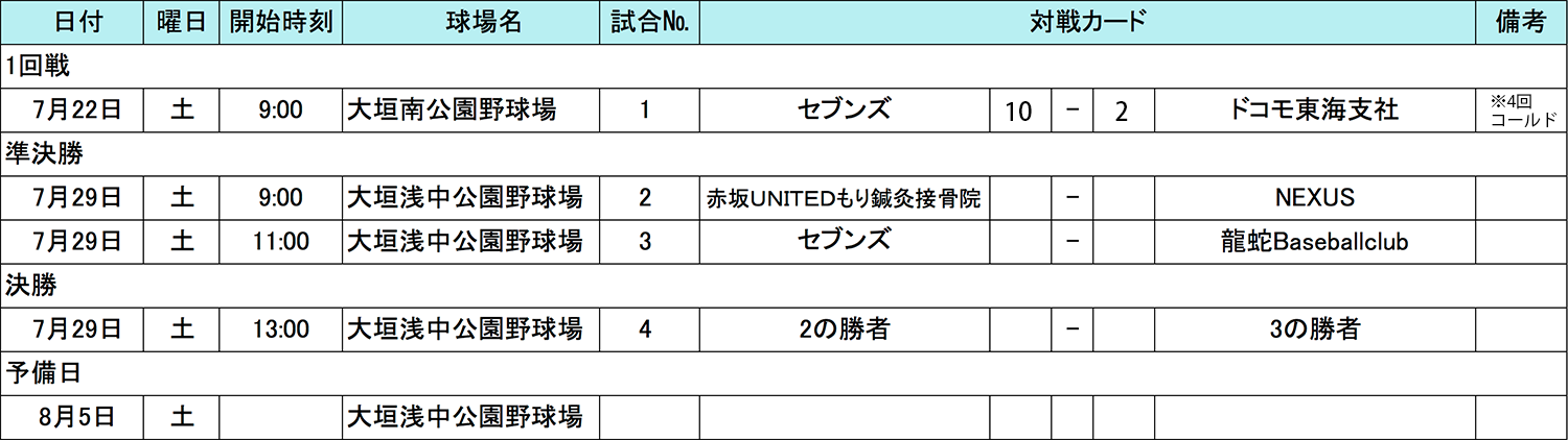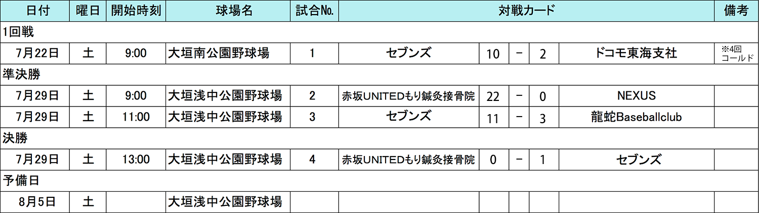 7月29日(土)に大垣浅中公園野球場にて、準決勝〜決勝が行われましたので結果をお知らせいたします。赤坂UNITEDもり鍼灸接骨院○VS⚫️NEXUS、セブンズ○VS⚫️龍蛇Baseballclubの結果、赤坂UNITEDもり鍼灸接骨院とセブンズが決勝に進み対決をしました。決勝戦は投手戦でワンチャンスをものにしましたセブンズが優勝し、東海地区代表決定戦へ進むこととなりました!現在東海地区は三重ブロックが現在予選の真っ最中、愛知ブロックはこれから組み合わせ抽選会、静岡ブロックはチーム募集中となります。どのチームが東海地区代表戦を制するのか、楽しみですね!