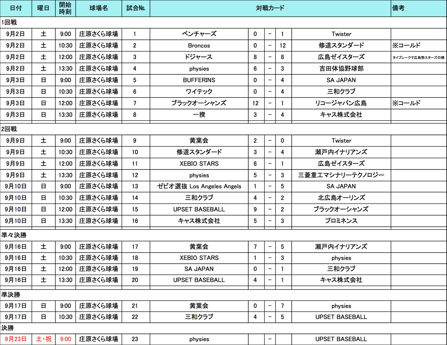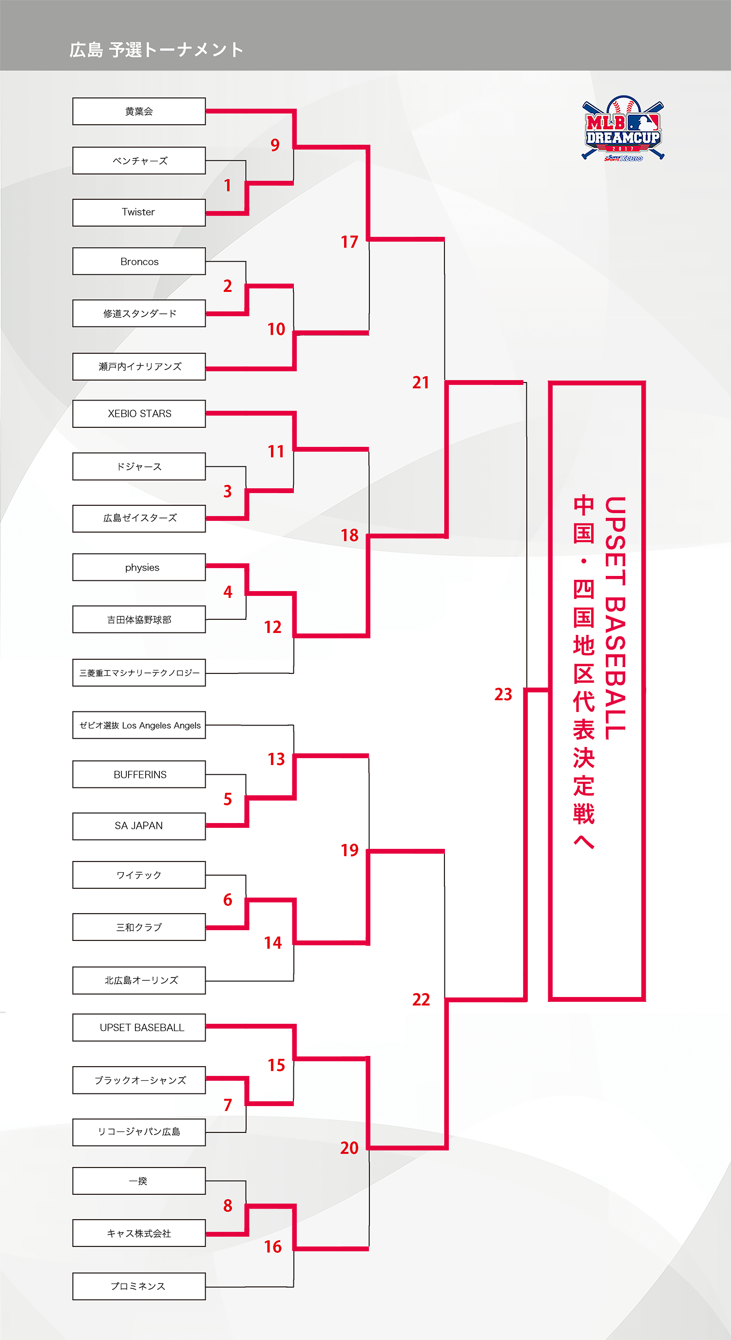 HOME > アーカイブ > アーカイブ 中国・四国地区 試合結果(予選) 広島ブロック・試合結果 2017年9月26日 広島県の参加者の皆様、お待たせ致しました。9月23日(土)に決勝戦が行われましたので、結果をお知らせいたします。「physies」VS「UPSET BASEBALL」3-4にて「UPSET BASEBALL」チームが、中国・四国大会に進出が決定いたしました!おめでとうございます。沖縄に向けて引き続き奮ってください!「physies」大健闘でお疲れ様でした、SNS投稿ありがとうございます、来年は熱盛な活躍ができますよう一同お待ちをしております! 試合表を拡大 九州沖縄地区の日程はこちら note -アーカイブ, 中国・四国地区, 試合結果(予選)