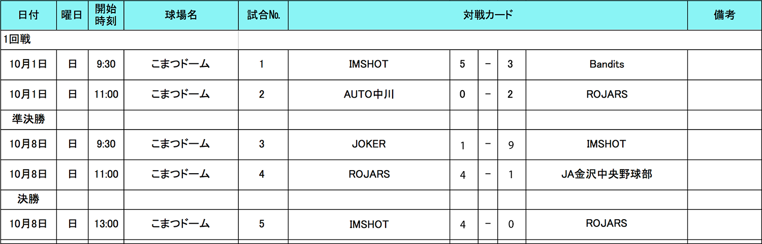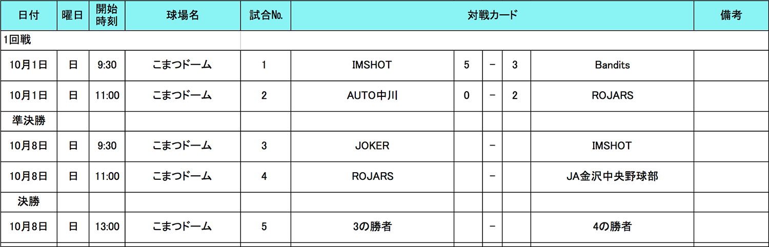 HOME > アーカイブ > アーカイブ 北信越地区 試合結果(予選) 石川ブロック・試合結果 2017年10月10日 石川県の参加者の皆様、大変お待たせ致しました。 10月8日(日)の 準決勝〜決勝の結果をアップ致しました。トーナメント戦の結果、石川ブロックは「IMSHOT」チームが代表に決定しました!準優勝の「ROJARS」チームも健闘をいただき有り難うございました、また来年もお待ちしております。 試合表を拡大 北信越地区の日程はこちら note -アーカイブ, 北信越地区, 試合結果(予選)