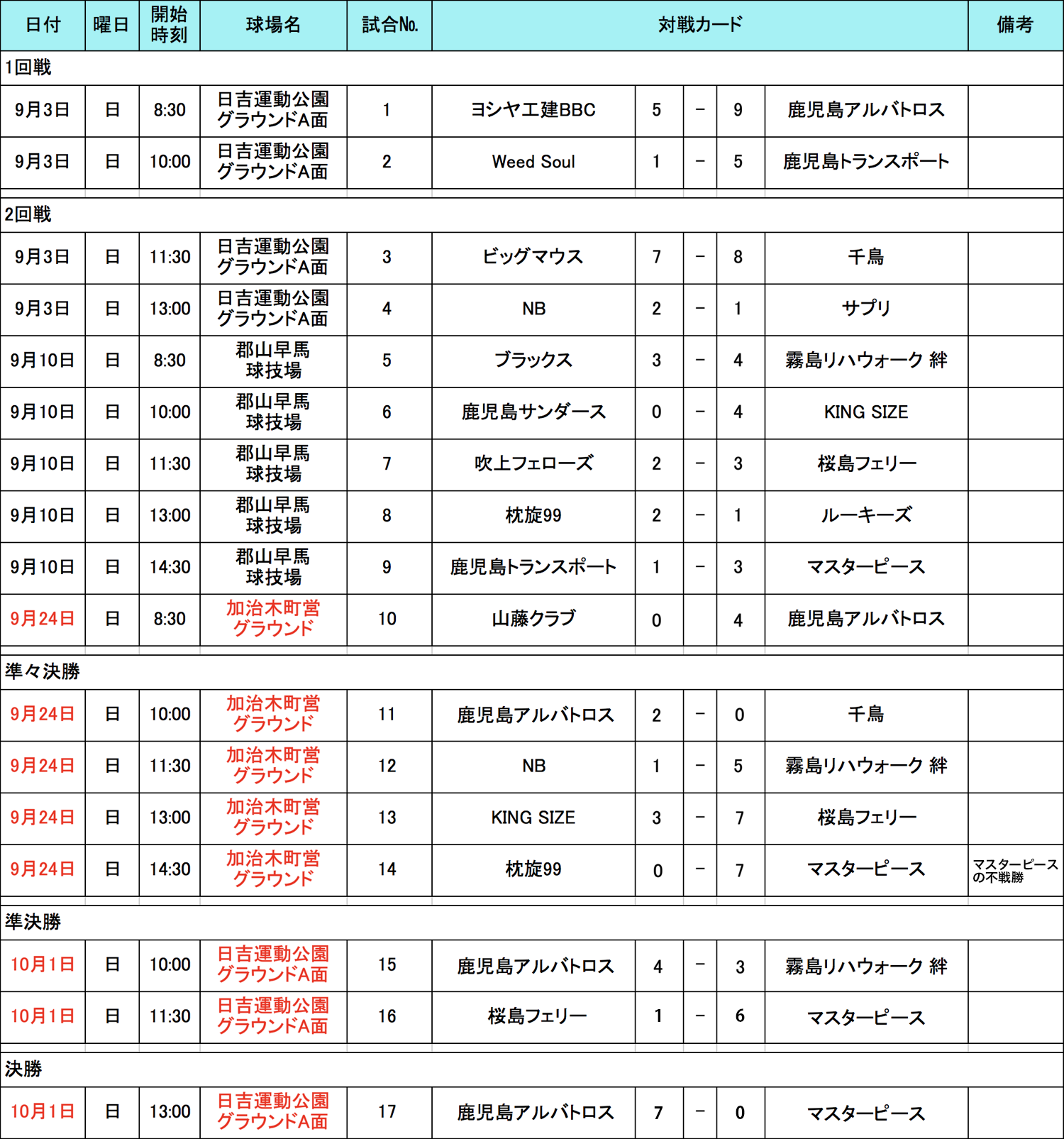 HOME > アーカイブ > アーカイブ 九州・沖縄地区 試合結果(予選) 鹿児島ブロック・試合結果 2017年9月12日 鹿児島県の参加者の皆様お待たせ致しました、情報掲載が遅れており申し訳ございませんでした、鹿児島のトーナメント戦の結果をお知らせ致します。鹿児島ブロック代表は「鹿児島アルバトロス」チームに決定しております。鹿児島ブロックは九州・沖縄地区では参加チーム多数の激戦区の一つでした、その中で準優勝の「マスターピース」、4強の「桜島フェリー」「霧島リハウォーク絆」も健闘をいただきお疲れ様でした、また来年もおまちしております。 試合表を拡大 九州・沖縄地区の詳細日程はこちら note -アーカイブ, 九州・沖縄地区, 試合結果(予選)