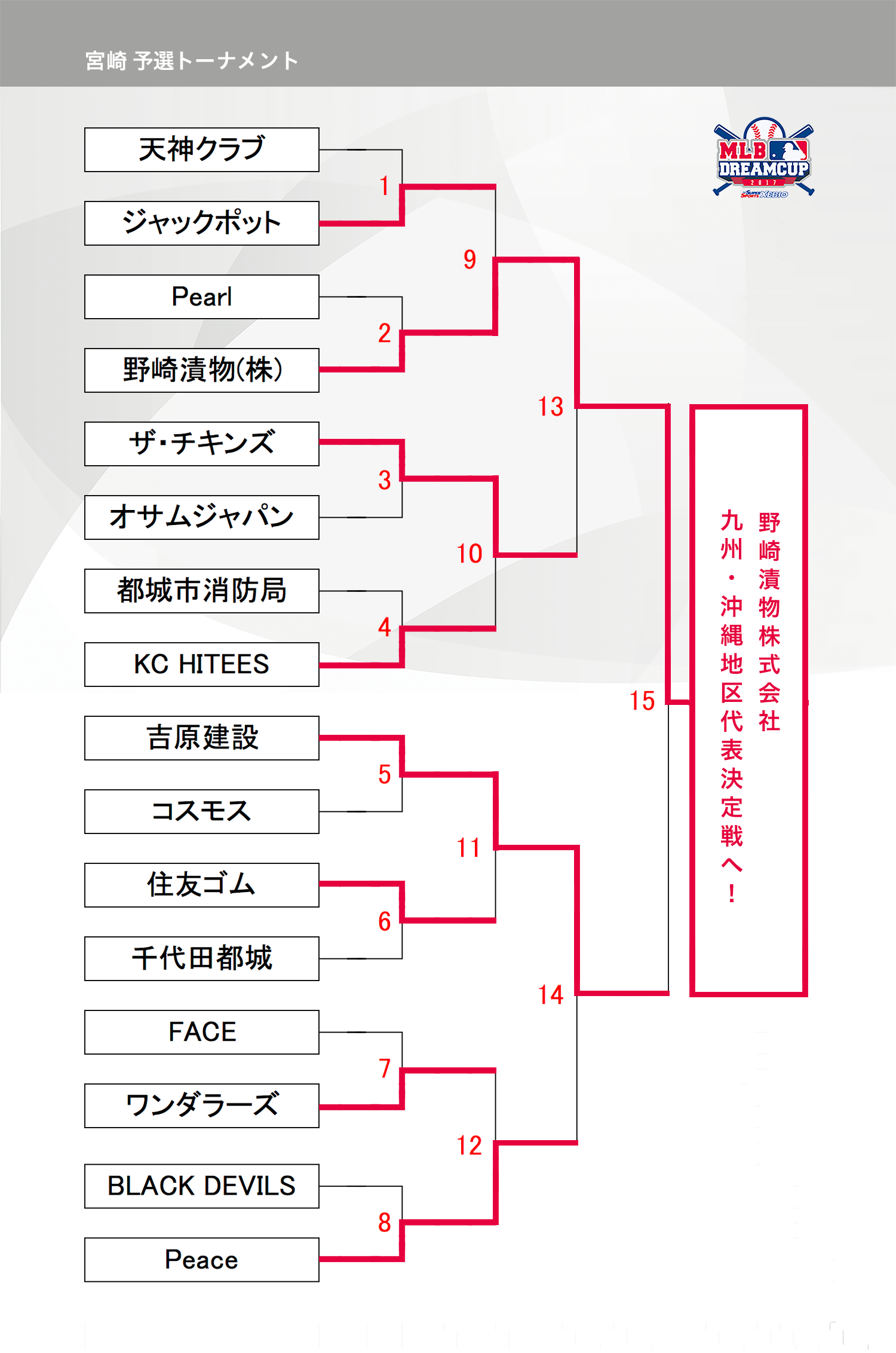 HOME > アーカイブ > アーカイブ 九州・沖縄地区 試合結果(予選) 宮崎ブロック・試合結果 2017年10月4日 宮崎県の参加者の皆様、お待たせいたしました。10月1日(日)に準決勝〜決勝が行われましたので、結果をお知らせします。準決勝「野崎漬物(株)」VS「ザ・チキンズ」の結果2-0で、すでに決勝進出を決めていた「吉原建設」VS「野崎漬物(株)」で決勝戦が行われ、見事1-4で「野崎漬物(株)」が宮崎ブロック優勝を決め、九州・沖縄代表決定戦に進むこととなりました。「吉原建設」も一気に決勝まで進む進撃、大健闘でお疲れ様でした、また来年もお待ちしております! 試合表を拡大 九州・沖縄地区の詳細日程はこちら note -アーカイブ, 九州・沖縄地区, 試合結果(予選)