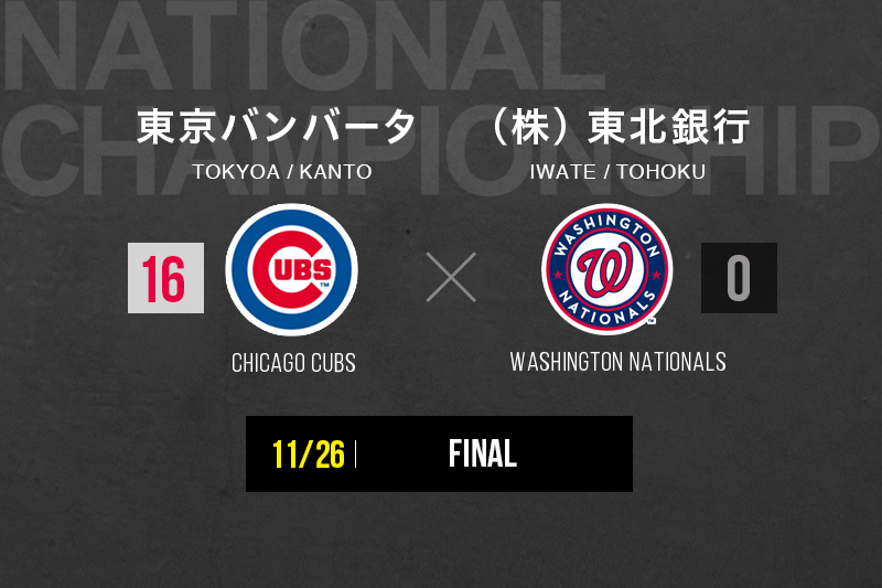 『東京バンバータが日本一に!プレッシャーに打ち勝ち、昨年の悲願達成!』初回から効率良く得点を重ねた東京バンバータが、終わってみれば16対0で完勝し、最高の形で昨年のリベンジを果たした。