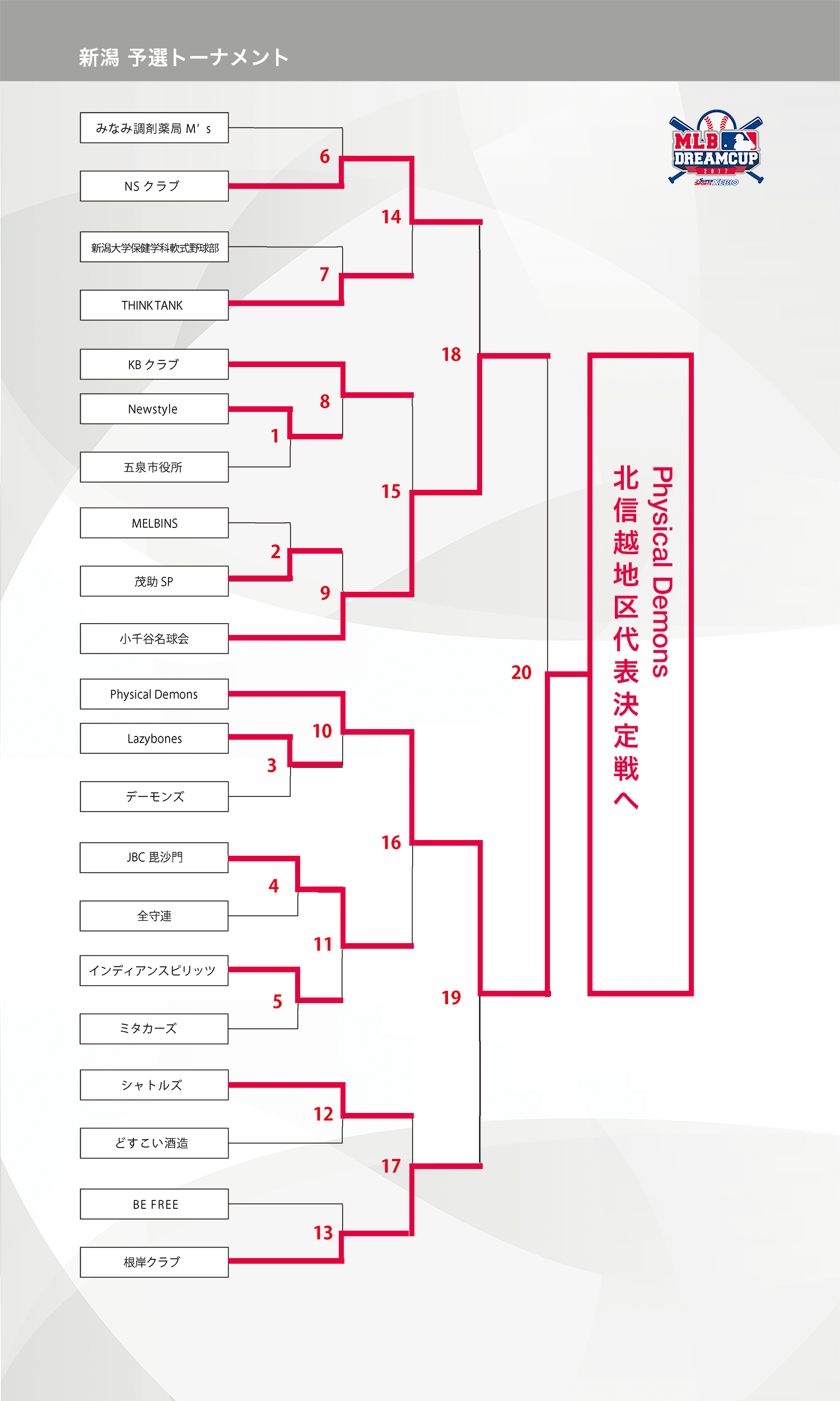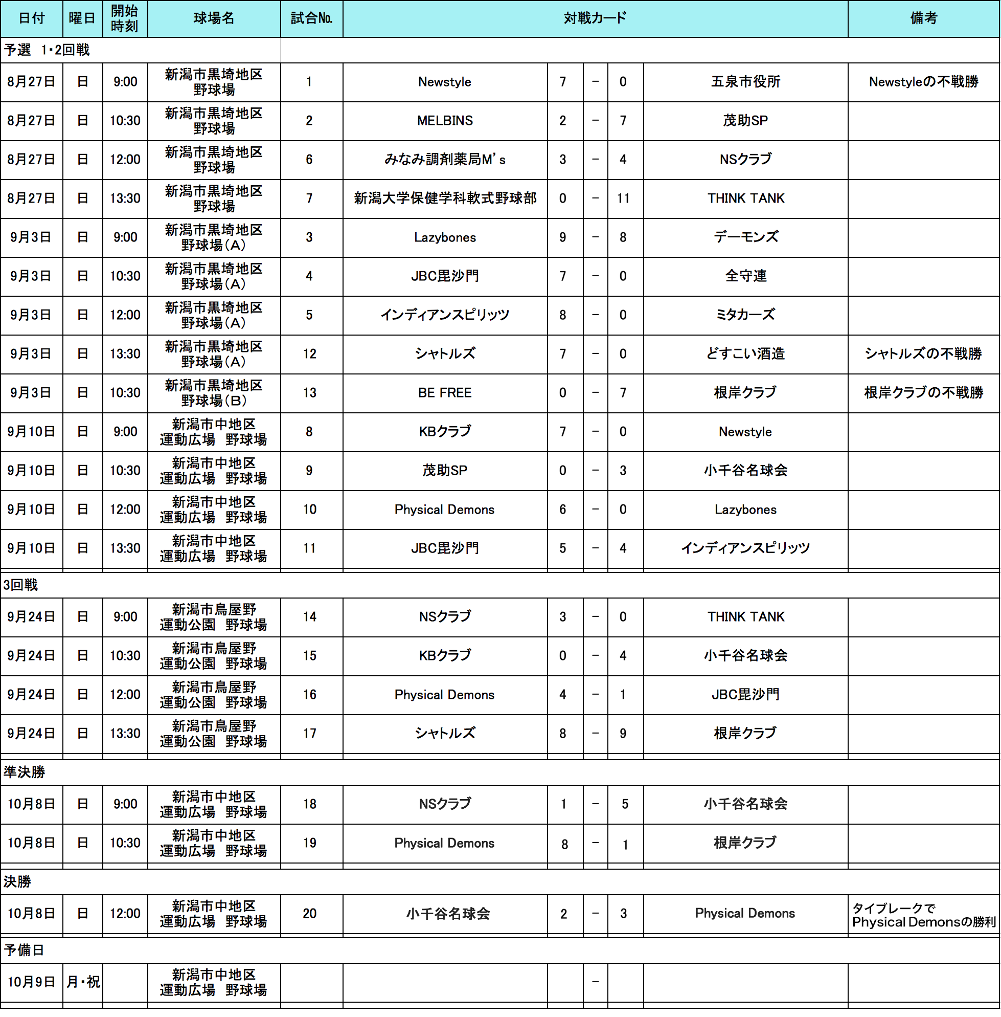 10月8日(日)に準決勝〜決勝が行われましたので結果をお知らせします。準決勝を経て「小千谷名球会」VS 「Physical Demons」で決勝が行われ2-3タイブレークで「Physical Demons」チームが北信越地区代表決定戦へ進むこととなりました、おめでとうございます!昨年の北信越地区代表、「小千谷名球会」も安定の勝ち上がりで健闘をいただきお疲れ様でした。また来年もおまちしております!