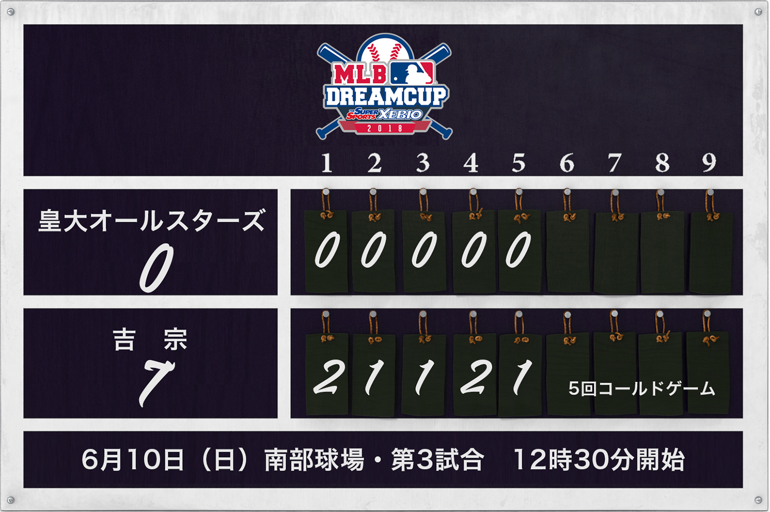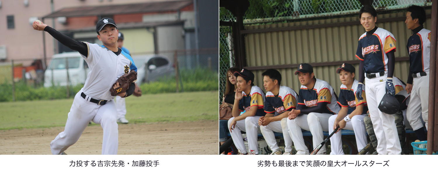 反撃に転じたい皇大オールスターズだったが、吉宗先発・加藤投手の威力あるストレートに抑えこまれ、4回まで1人の走者も出すことができず無得点。追い込まれた皇大オールスターズは、5回に1点を奪われ、大会規定によるコールドゲームとなった。