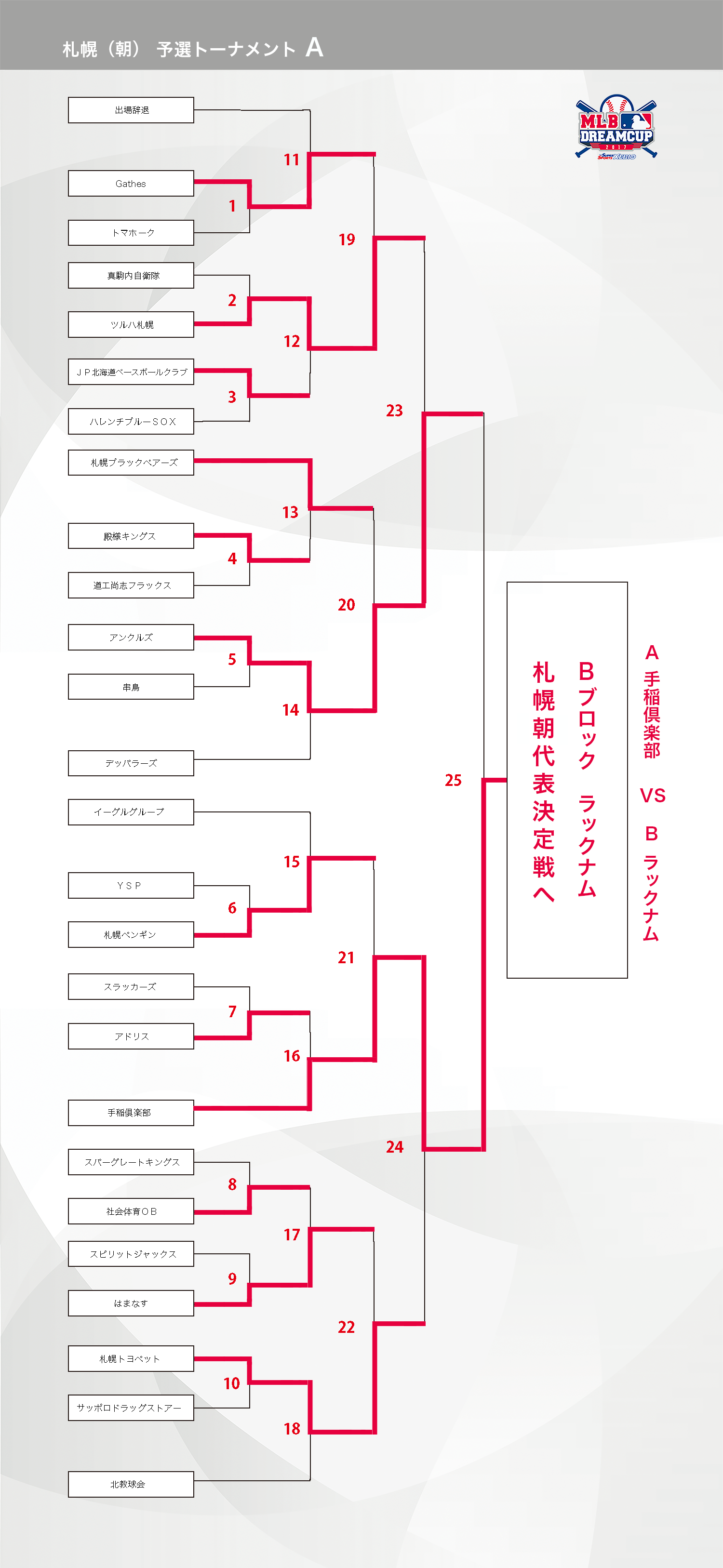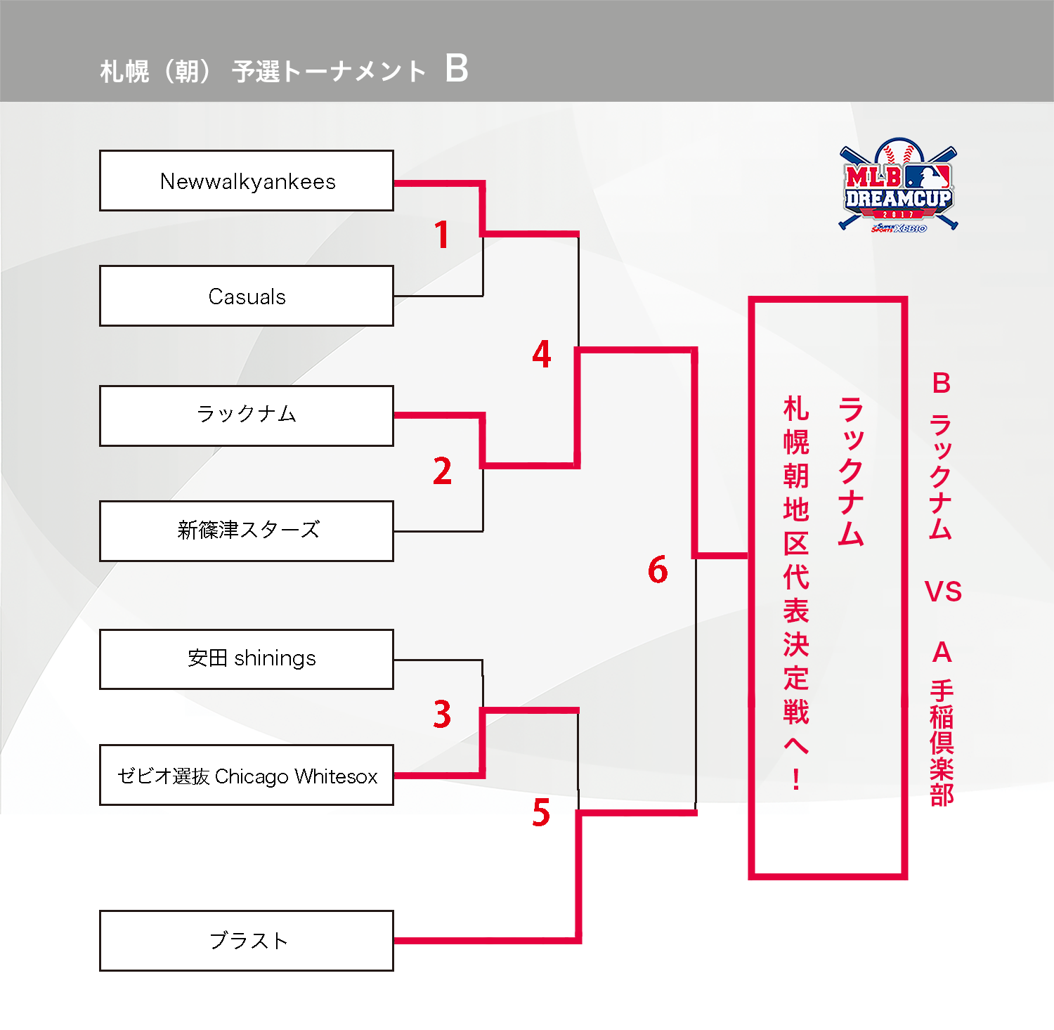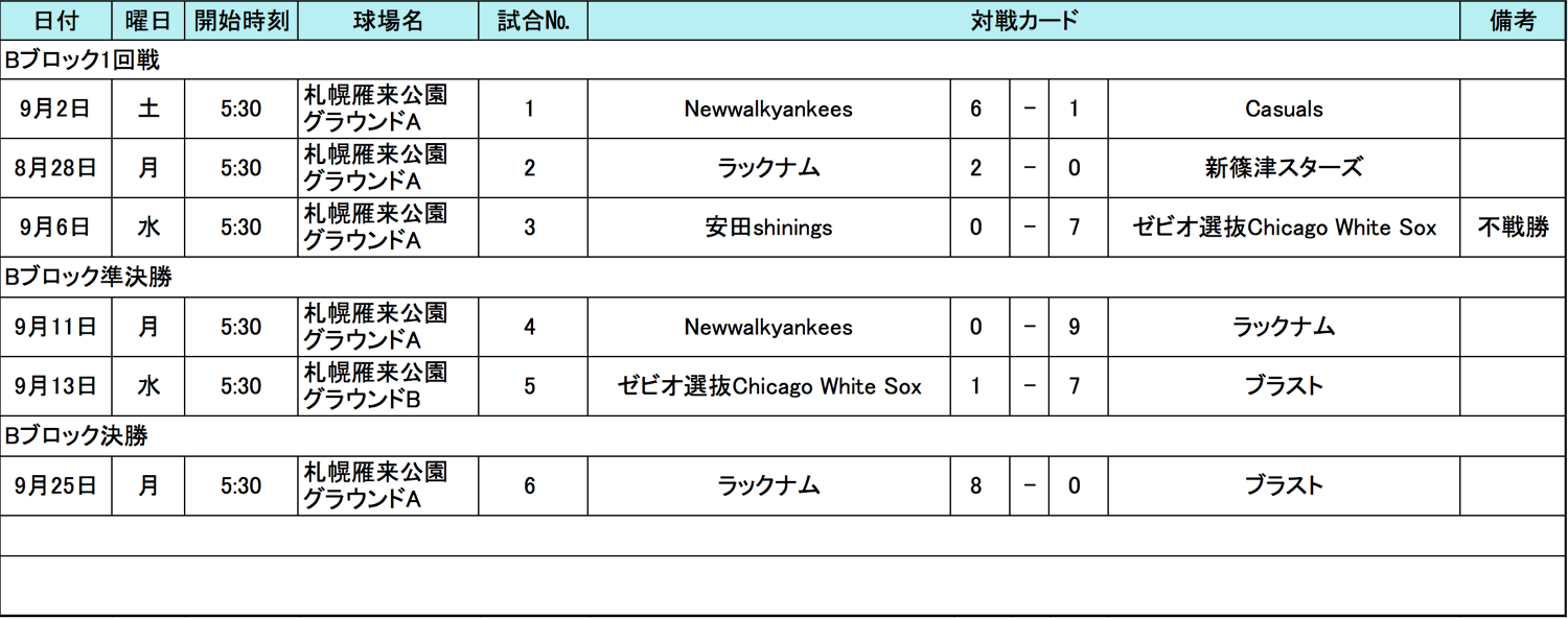 HOME > アーカイブ > アーカイブ 北海道地区 試合結果(予選) 札幌(朝)ブロック・試合結果 2017年9月28日 札幌にて早朝試合開始(朝)ブロックの参加者の皆様、試合結果掲載が遅くなりまして、大変申し訳ございません。 9月28日(木)にAブロックトップチームの「手稲倶楽部」VS Bブロックトップチームの「ラックナム」戦が行われ、札幌朝代表は「ラックナム」となりました。 試合表を拡大 試合表を拡大 北海道地区の詳細日程はこちら note -アーカイブ, 北海道地区, 試合結果(予選)