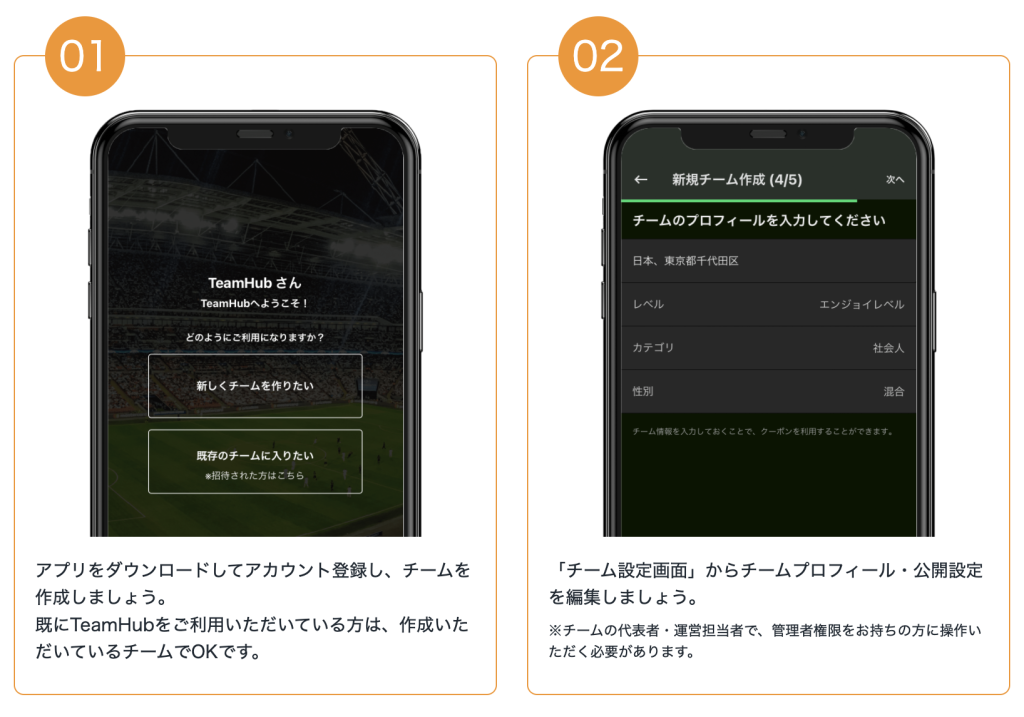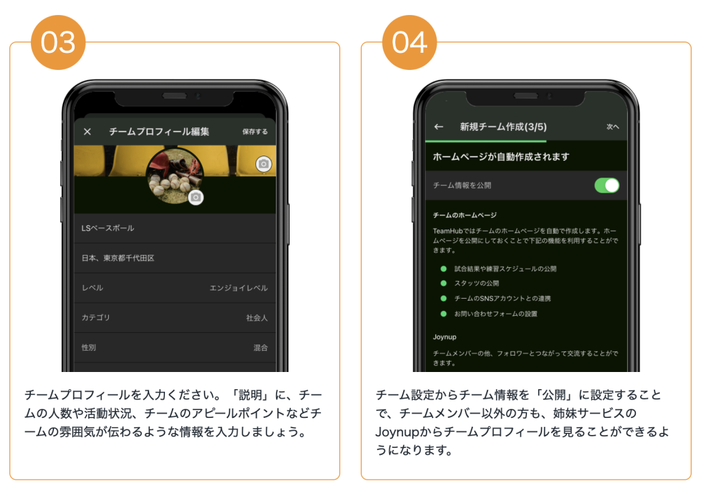 ①TeamHub/PLAYにチームを登録して、チームプロフィールを入力してください。