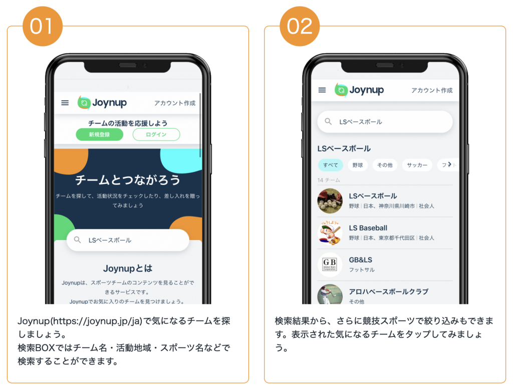 TeamHubまたはPLAYに登録いただくことで、姉妹WEBサービス「Joynup」を通じて誰でもあなたのチームを応援(フォロー)できるようになります。