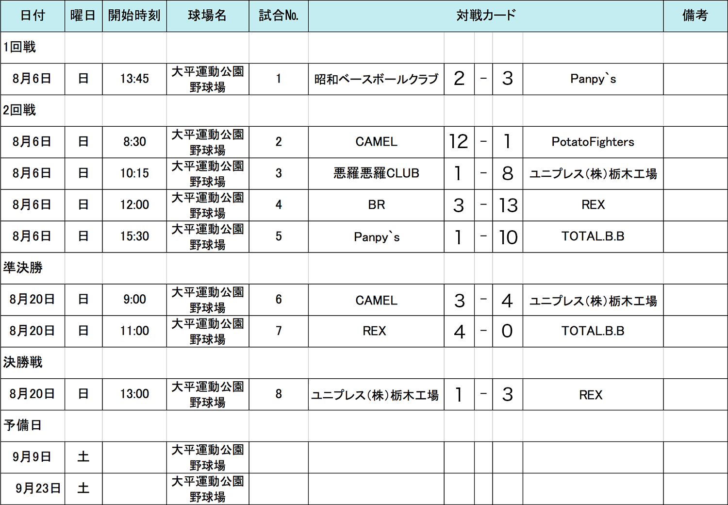 HOME > アーカイブ > アーカイブ 試合結果(予選) 関東地区 栃木ブロック・試合結果 2017年8月22日 栃木県の参加者の皆様、お待たせいたしました。8月20日(日)に準決勝〜決勝が行われましたので結果をお知らせいたします。決勝は「ユニプレス(株)栃木工場」VS「REX」で行われることとなり、見事「REX」が関東地区代表決定戦へ進むこととなりました。 市区町村大会上位進出をしている「ユニプレス(株)栃木工場」、そして準決勝まで進んだ「CAMEL」「TOTALB.B」の皆様、健闘でお疲れ様でした!!来年もおまちしております。 試合結果表を拡大 関東地区の詳細日程はこちら note -アーカイブ, 試合結果(予選), 関東地区