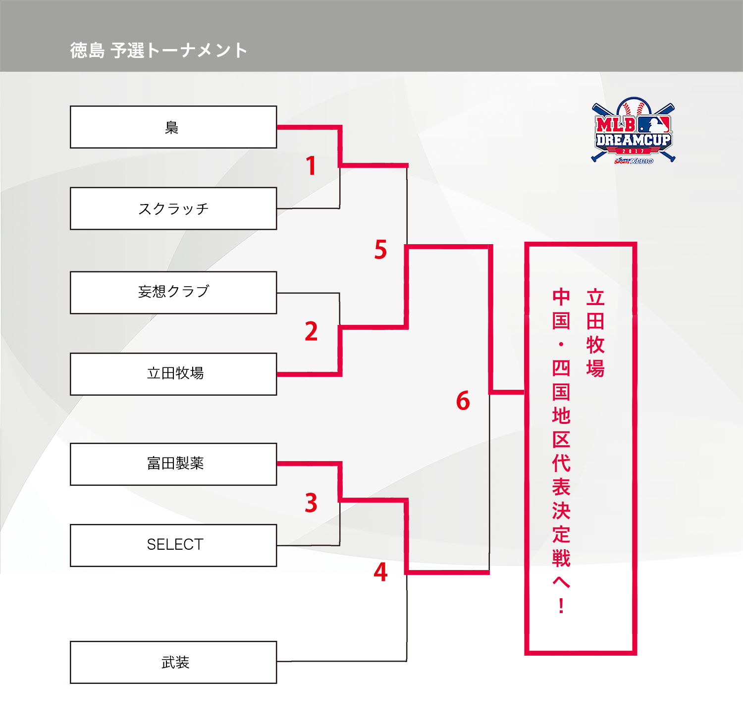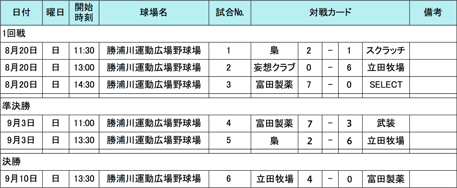 徳島県の参加者の皆様、お待たせいたしました。9月 10日(日)「立田牧場」VS「富田製薬」決勝戦の結果をお知らせ致します。4-0で「立田牧場」が中国・四国代表決定戦に進むこととなりました!「富田製薬」もお疲れ様でした、また来年もおまちしております!